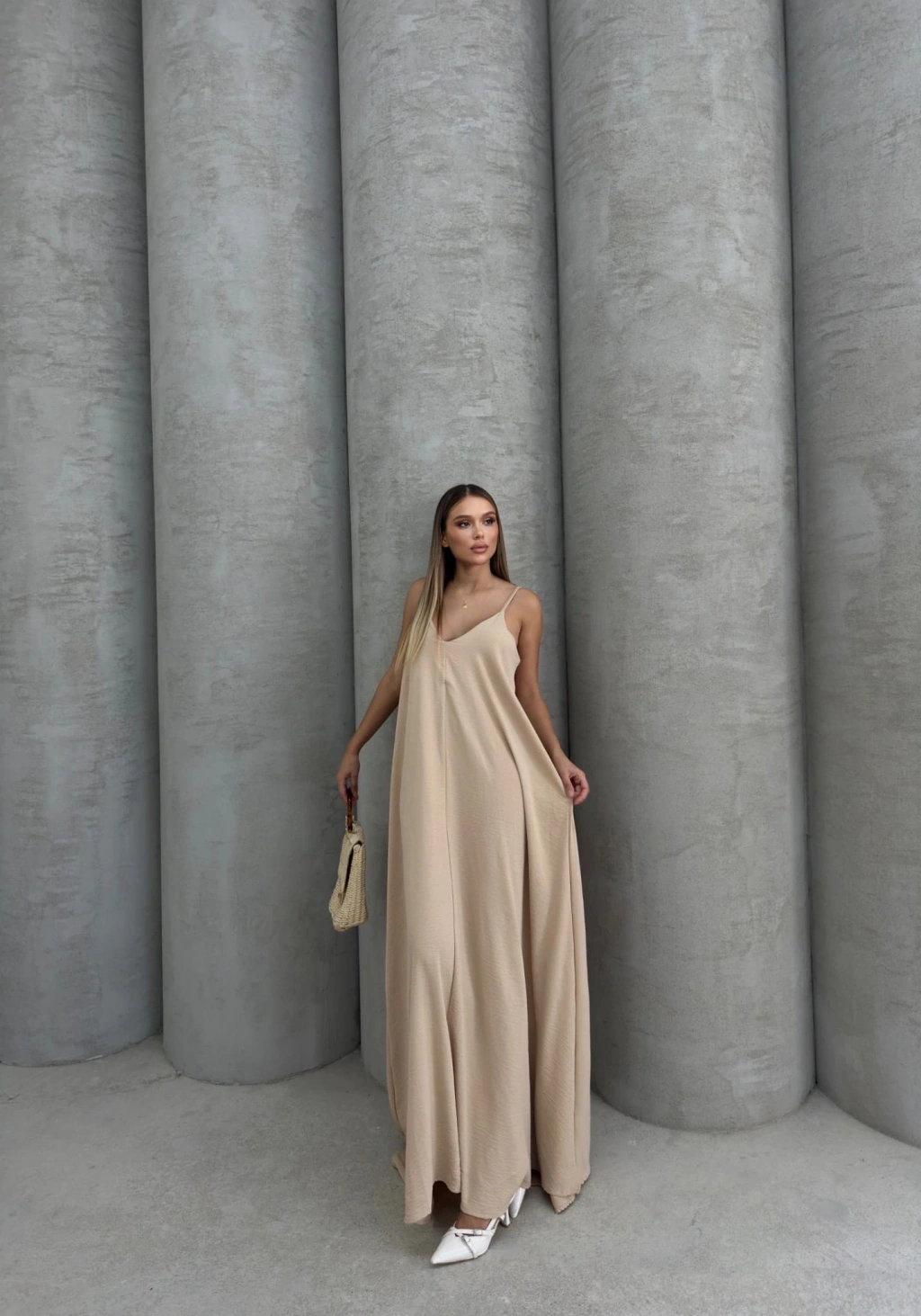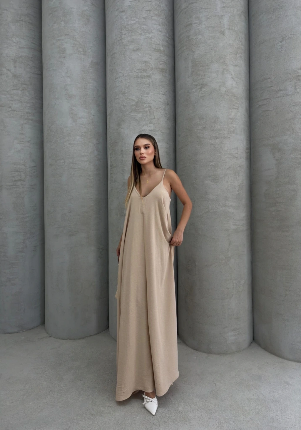 Aerobin uzun elbise, şıklığı ve rahatlığı bir arada sunan bir parçadır. Bej rengi, her mevsim kullanabileceğiniz ve farklı kombinasyonlar yaratabileceğiniz bir seçenektir.
