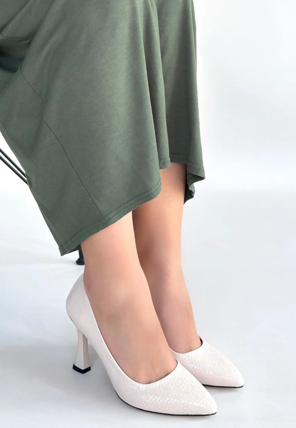 • Merio Bej Baskılı Rugan Topuklu Ayakkabı