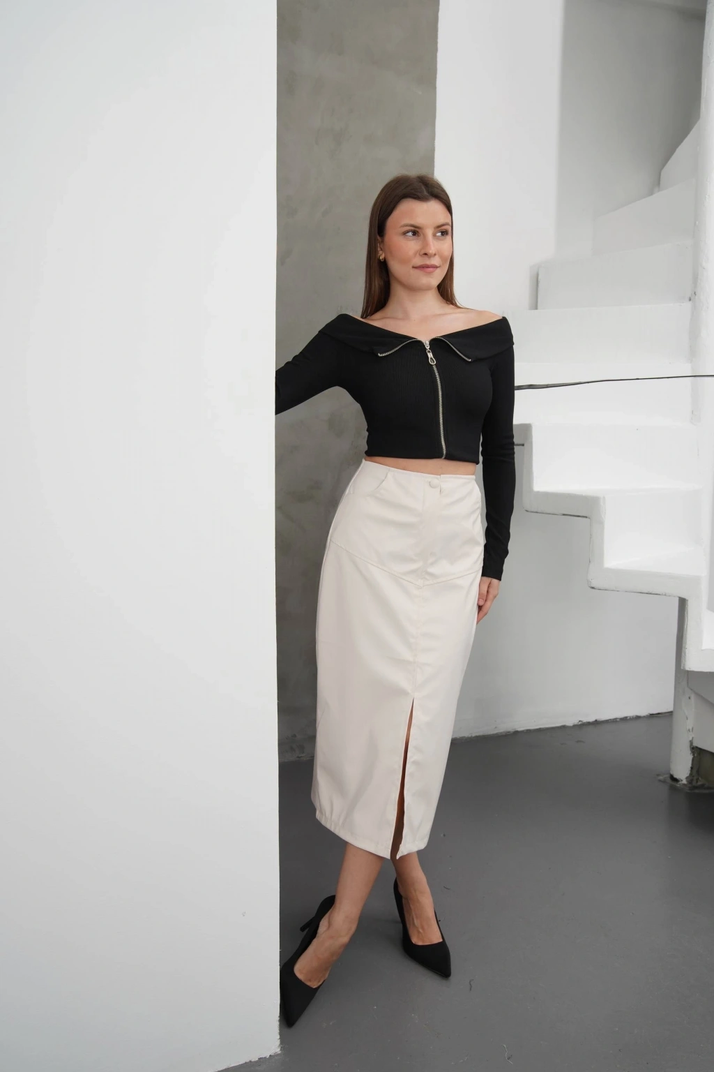 Yırtmaçlı uzun deri etek krem rengiyle gardırobunuza şıklık katacak bir parçadır.